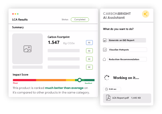 Generate accurate, data-driven impact assessments in minutes. Our AI automates material footprinting, emissions modeling, and compliance-ready reporting-delivering faster, more precise insights without manual complexity.