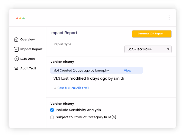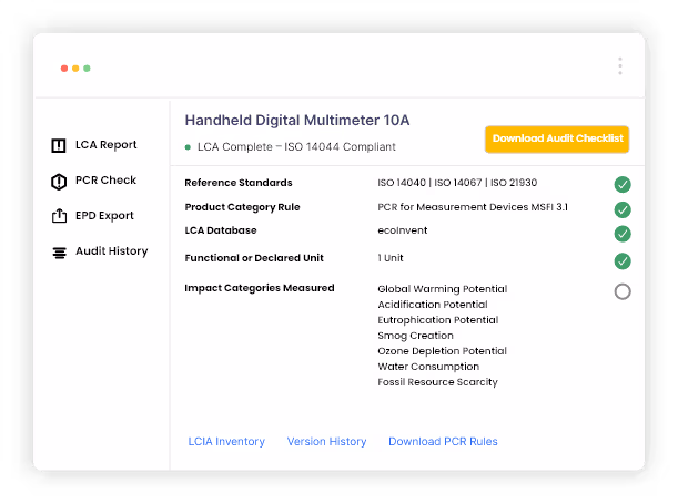 Leverage automated Life Cycle Assessments (LCAs) built specifically to comply with ISO, EN, and PCR requirements.